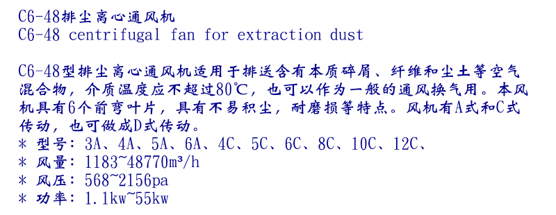 c6-48后傾式工業(yè)離心通風機適用于排送含有本質(zhì)碎屑、纖維和塵土等空氣混合物,介質(zhì)溫度應(yīng)不超過80℃,也可以作為一般的通風換氣用。本風機具有6個前彎葉片,具有不易積塵,耐磨損等特點。